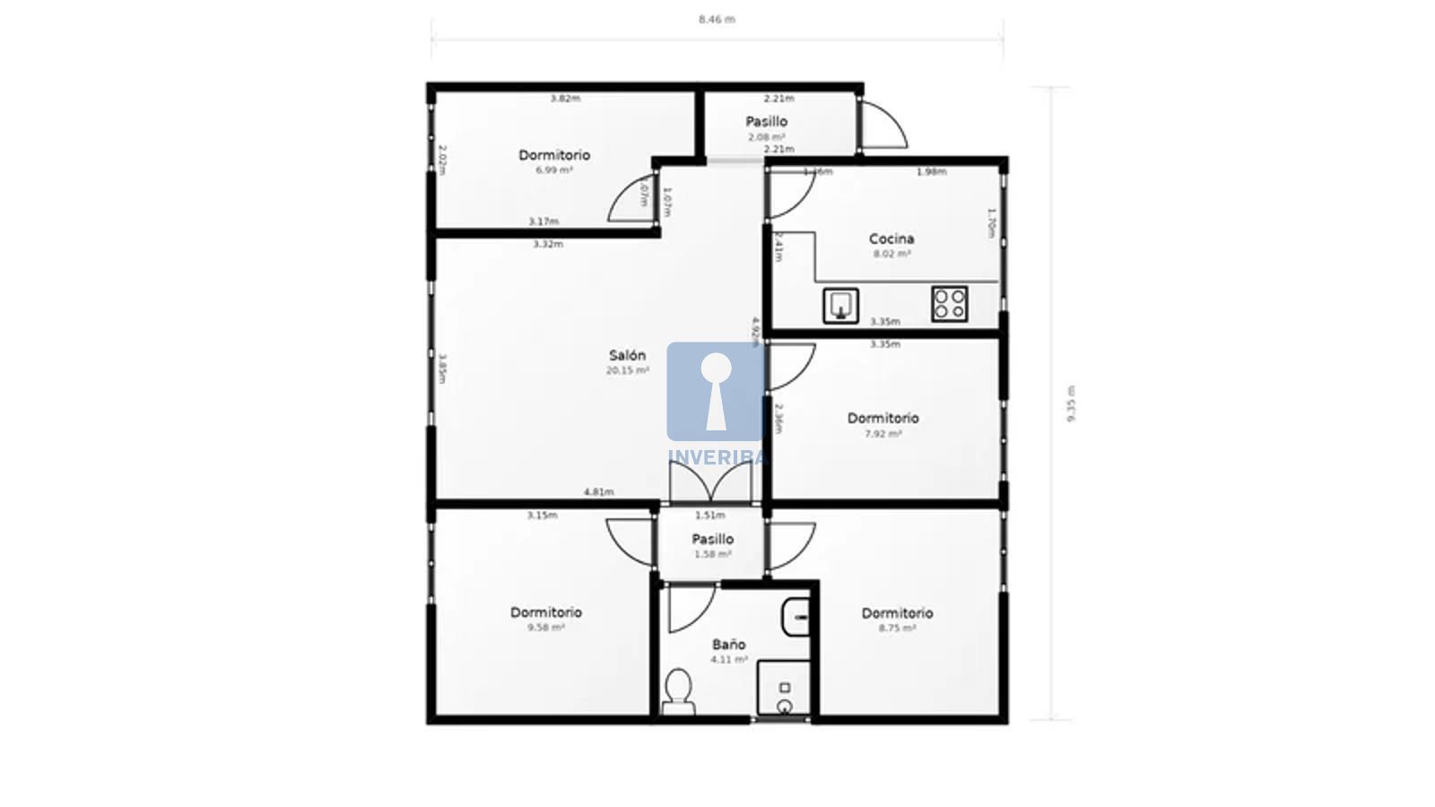 El inmueble dispone de una superficie de 79 m² construidos distribuidos en cuatro habitaciones, salón-comedor, cocina y un aseo.